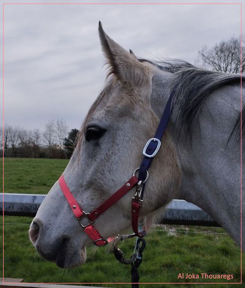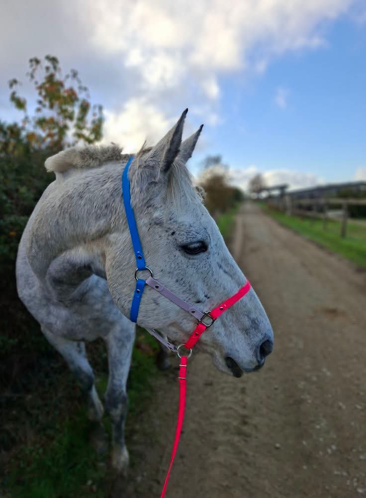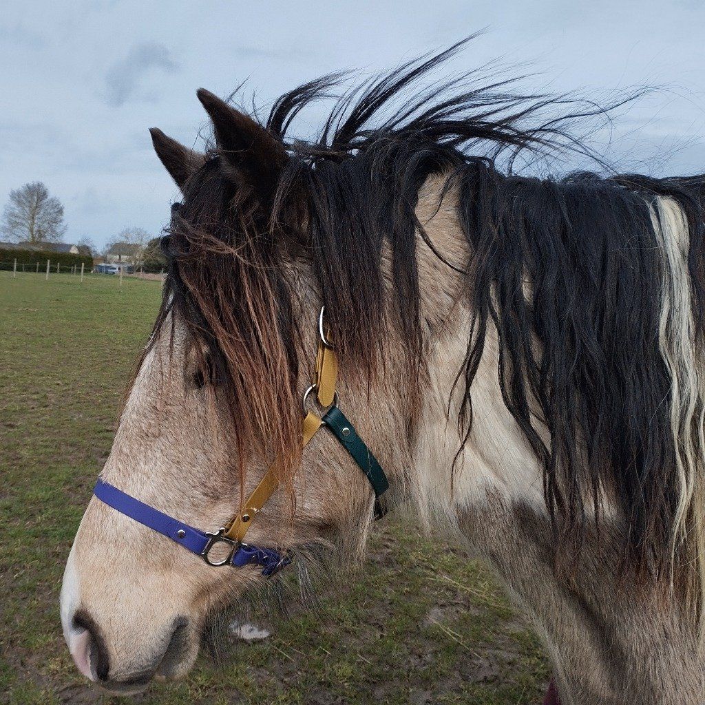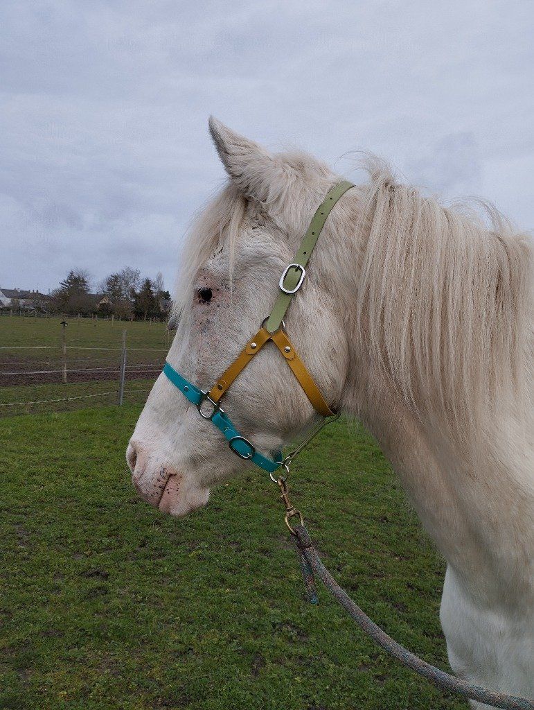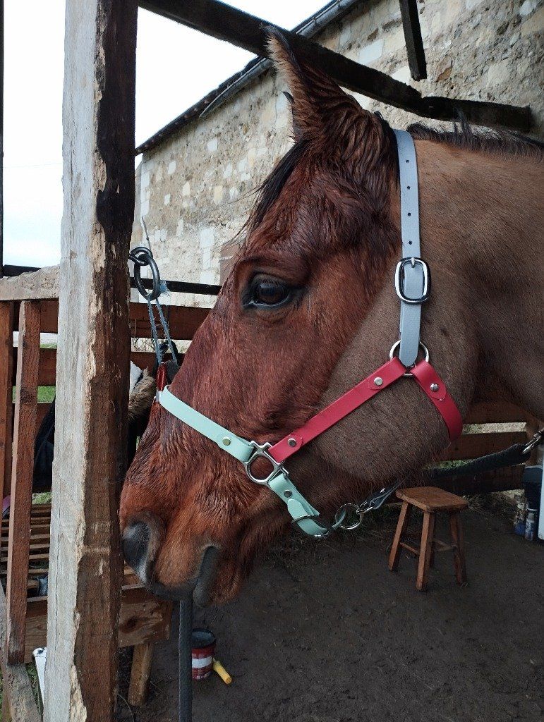 Les licols réalisés à l'atelier sont cousus main ou rivetés selon les modèles, réglables à la têtiere et à la muserolle.